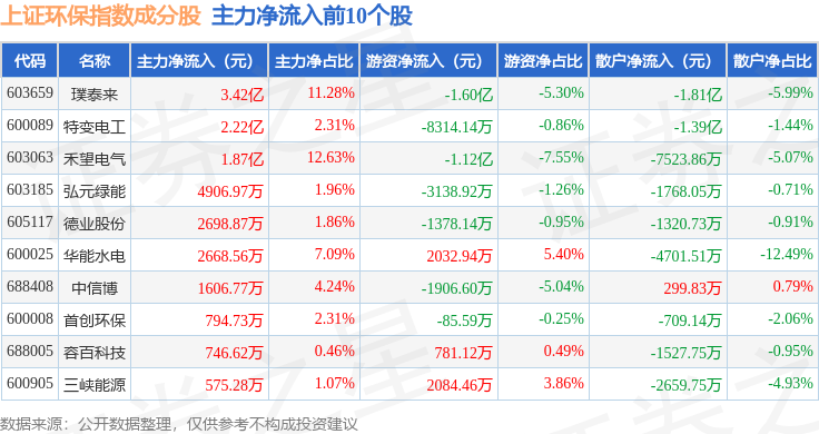 资金流向方面,上证环保(000158)指数成份股当日主力资金净流出合计4.39亿元,游资资金净流入合计7830.07万元,散户资金净流入合计3.61亿元。成份股资金流向详情见下表: