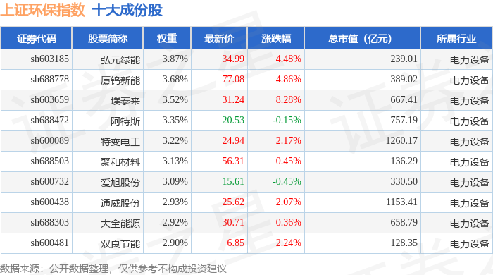 证券之星消息,11月13日,上证环保(000158)指数报收于1439.23点,涨1.92%,成交538.92亿元,换手率1.46%。当日该指数成份股中,上涨的有29家,璞泰来以8.28%的涨幅领涨,下跌的有10家,国投电力以3.01%的跌幅领跌。