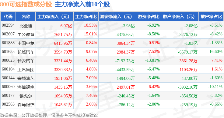 资金流向方面,800可选(000931)指数成份股当日主力资金净流出合计6.82亿元,游资资金净流出合计2.52亿元,散户资金净流入合计9.34亿元。成份股资金流向详情见下表: