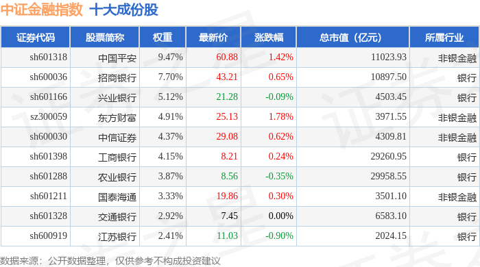 证券之星消息,11月13日,中证金融(000934)指数报收于6360.87点,涨0.53%,成交762.93亿元,换手率0.41%。当日该指数成份股中,上涨的有71家,上海临港以8.31%的涨幅领涨,下跌的有27家,滨江集团以3.33%的跌幅领跌。