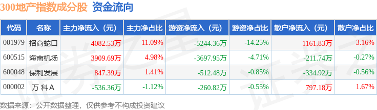 资金流向方面,300地产(000952)指数成份股当日主力资金净流入合计8303.26万元,游资资金净流出合计9715.61万元,散户资金净流入合计1412.35万元。成份股资金流向详情见下表: