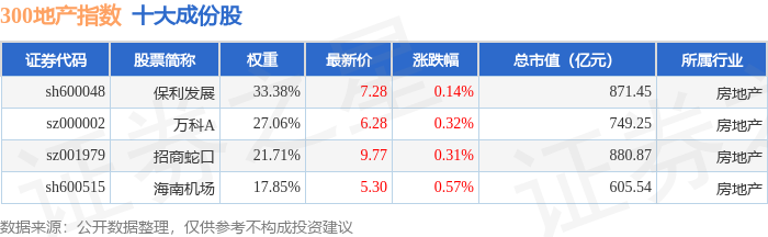 证券之星消息,11月13日,300地产(000952)指数报收于2888.1点,涨0.3%,成交22.33亿元,换手率0.88%。当日该指数成份股中,上涨的有4家,海南机场以0.57%的涨幅领涨。