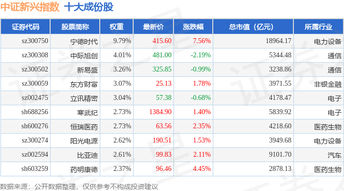 证券之星消息,11月13日,中证新兴(000964)指数报收于11154.1点,涨1.89%,成交2819.04亿元,换手率1.33%。当日该指数成份股中,上涨的有74家,亿纬锂能以9.19%的涨幅领涨,下跌的有25家,蓝思科技以2.25%的跌幅领跌。