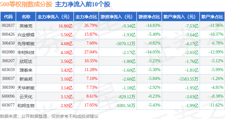 资金流向方面,500等权(000982)指数成份股当日主力资金净流入合计56.99亿元,游资资金净流出合计41.84亿元,散户资金净流出合计15.15亿元。成份股资金流向详情见下表: