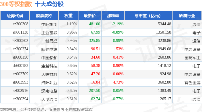 300等权(000984)指数十大成份股详情如下: