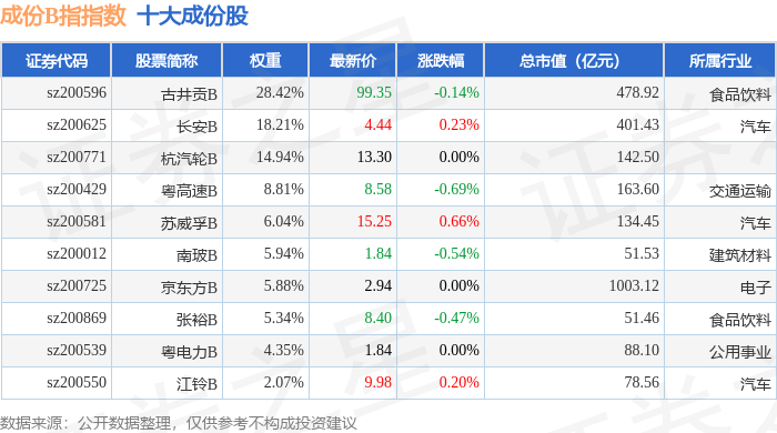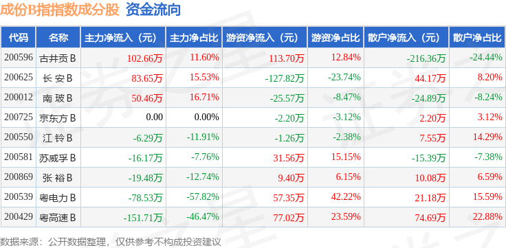 资金流向方面,成份B指(399003)指数成份股当日主力资金净流出合计35.41万元,游资资金净流入合计132.19万元,散户资金净流出合计96.78万元。成份股资金流向详情见下表: