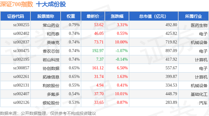 深证700(399010)指数十大成份股详情如下: