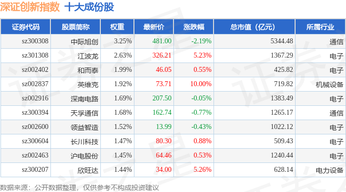 证券之星消息,11月13日,深证创新(399016)指数报收于5637.74点,涨1.64%,成交1536.34亿元,换手率2.06%。当日该指数成份股中,上涨的有81家,盛弘股份以18.44%的涨幅领涨,下跌的有18家,信维通信以3.7%的跌幅领跌。