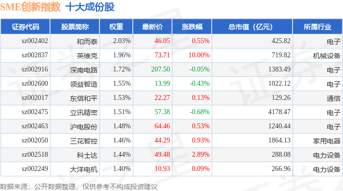 证券之星消息,11月13日,SME创新(399017)指数报收于4758.21点,涨1.05%,成交901.55亿元,换手率2.18%。当日该指数成份股中,上涨的有73家,英维克以10.0%的涨幅领涨,下跌的有25家,良信股份以3.31%的跌幅领跌。