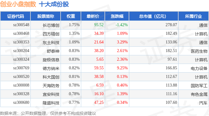 证券之星消息,11月13日,创业小盘(399020)指数报收于1744.06点,涨1.14%,成交850.37亿元,换手率4.09%。当日该指数成份股中,上涨的有217家,值得买以20.0%的涨幅领涨,下跌的有77家,乾照光电以4.05%的跌幅领跌。
