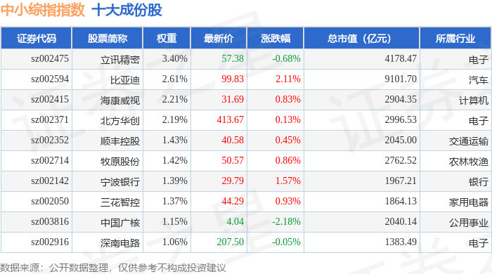 证券之星消息,11月13日,中小综指(399101)指数报收于14517.79点,涨1.35%,成交4259.8亿元,换手率3.33%。当日该指数成份股中,上涨的有730家,龙洲股份以10.09%的涨幅领涨,下跌的有208家,方正电机以7.92%的跌幅领跌。