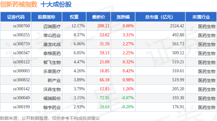 证券之星消息,11月13日,创新药械(399265)指数报收于1130.63点,涨1.22%,成交189.23亿元,换手率3.06%。当日该指数成份股中,上涨的有36家,富祥药业以20.03%的涨幅领涨,下跌的有14家,戴维医疗以1.32%的跌幅领跌。