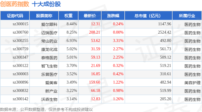 证券之星消息,11月13日,创医药(399275)指数报收于2842.45点,涨0.76%,成交163.6亿元,换手率1.8%。当日该指数成份股中,上涨的有32家,一品红以6.87%的涨幅领涨,下跌的有18家,瑞迈特以2.36%的跌幅领跌。