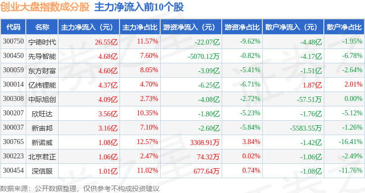 资金流向方面,创业大盘(399293)指数成份股当日主力资金净流入合计50.54亿元,游资资金净流出合计37.61亿元,散户资金净流出合计12.94亿元。成份股资金流向详情见下表: