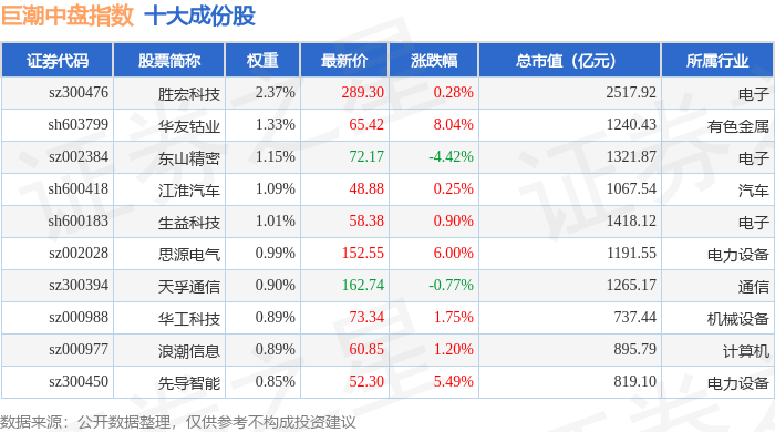 巨潮中盘(399315)指数十大成份股详情如下:
