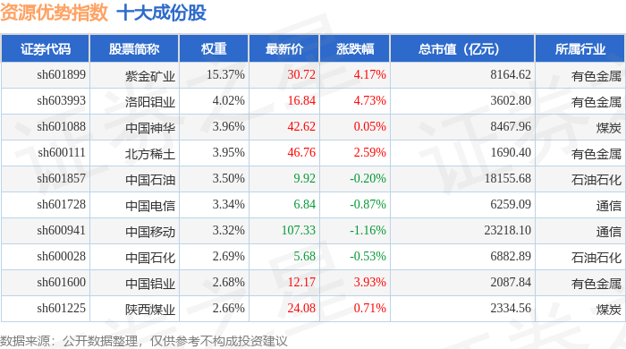 资源优势(399319)指数十大成份股详情如下: