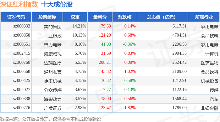 证券之星消息,11月13日,深证红利(399324)指数报收于9375.28点,涨0.76%,成交346.82亿元,换手率1.16%。当日该指数成份股中,上涨的有25家,藏格矿业以6.47%的涨幅领涨,下跌的有14家,招商公路以2.69%的跌幅领跌。