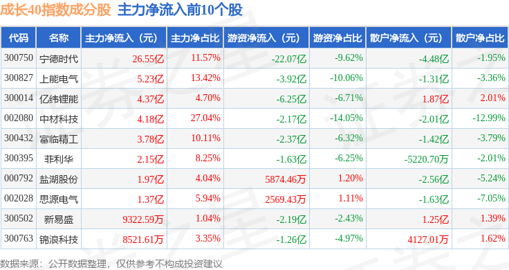 资金流向方面,成长40(399326)指数成份股当日主力资金净流入合计51.04亿元,游资资金净流出合计41.94亿元,散户资金净流出合计9.1亿元。成份股资金流向详情见下表: