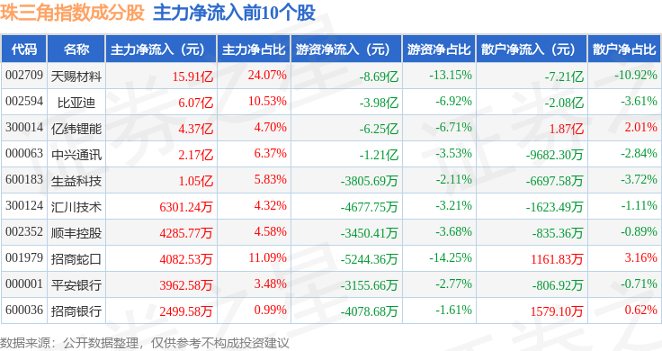 资金流向方面,珠三角(399356)指数成份股当日主力资金净流入合计17.69亿元,游资资金净流出合计20.75亿元,散户资金净流入合计3.05亿元。成份股资金流向详情见下表: