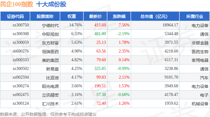民企100(399362)指数十大成份股详情如下: