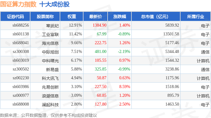 证券之星消息,11月13日,国证算力(399363)指数报收于8845.42点,涨1.04%,成交1231.2亿元,换手率1.63%。当日该指数成份股中,上涨的有42家,佰维存储以13.21%的涨幅领涨,下跌的有8家,中际旭创以2.19%的跌幅领跌。