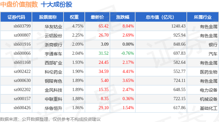 证券之星消息,11月13日,中盘价值(399375)指数报收于5964.68点,涨1.39%,成交652.96亿元,换手率1.19%。当日该指数成份股中,上涨的有61家,华友钴业以8.04%的涨幅领涨,下跌的有33家,四川路桥以2.96%的跌幅领跌。