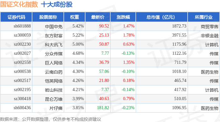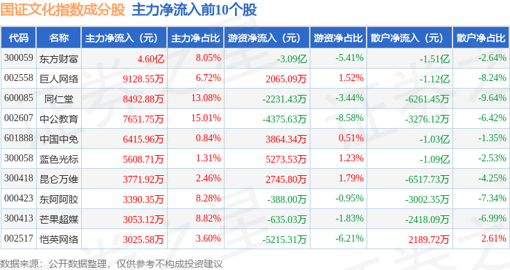 资金流向方面,国证文化(399397)指数成份股当日主力资金净流入合计1.42亿元,游资资金净流出合计1.82亿元,散户资金净流入合计4001.93万元。成份股资金流向详情见下表:
