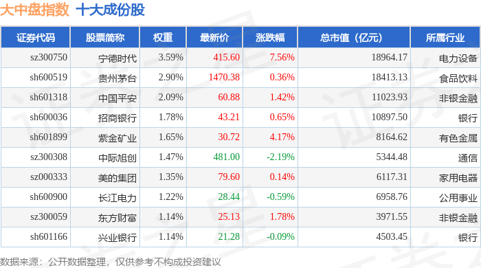 大中盘(399400)指数十大成份股详情如下: