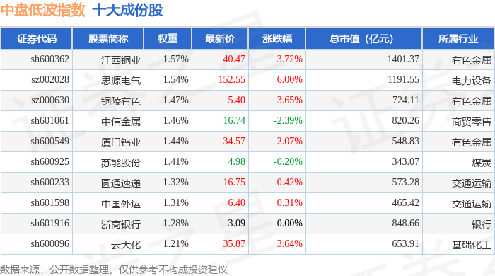 证券之星消息,11月13日,中盘低波(399406)指数报收于14103.87点,涨0.82%,成交498.71亿元,换手率1.1%。当日该指数成份股中,上涨的有58家,思源电气以6.0%的涨幅领涨,下跌的有34家,中信金属以2.39%的跌幅领跌。