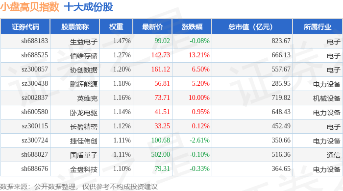 小盘高贝(399409)指数十大成份股详情如下: