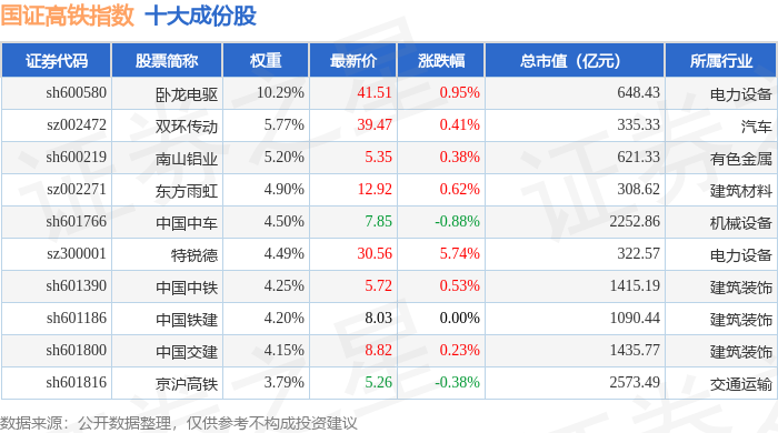 国证高铁(399419)指数十大成份股详情如下: