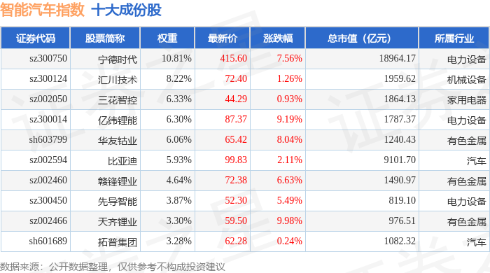 智能汽车(399432)指数十大成份股详情如下: