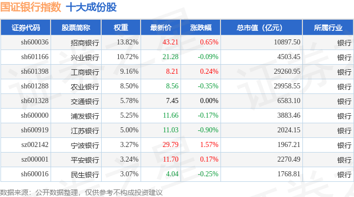 证券之星消息,11月13日,国证银行(399431)指数报收于8261.21点,跌0.03%,成交284.07亿元,换手率0.28%。当日该指数成份股中,上涨的有6家,宁波银行以1.57%的涨幅领涨,下跌的有21家,渝农商行以1.13%的跌幅领跌。