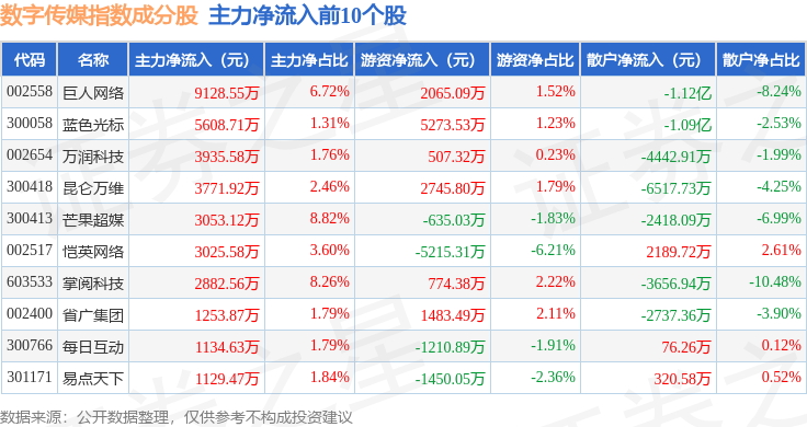资金流向方面,数字传媒(399434)指数成份股当日主力资金净流出合计4.13亿元,游资资金净流入合计1.62亿元,散户资金净流入合计2.51亿元。成份股资金流向详情见下表: