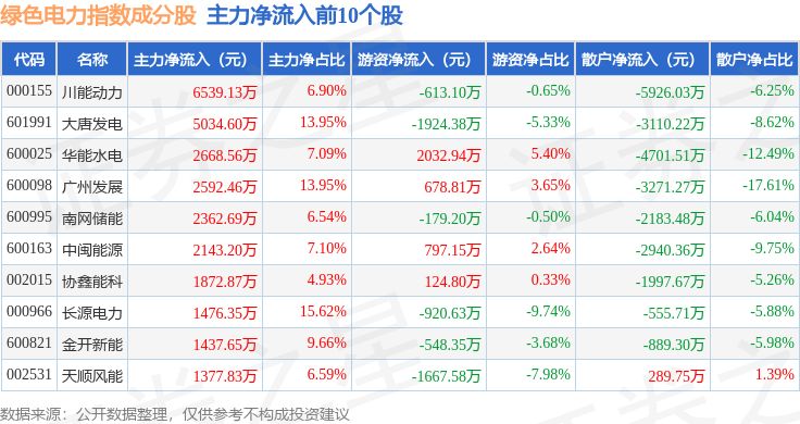 资金流向方面,绿色电力(399438)指数成份股当日主力资金净流出合计8.86亿元,游资资金净流入合计1.87亿元,散户资金净流入合计6.99亿元。成份股资金流向详情见下表: