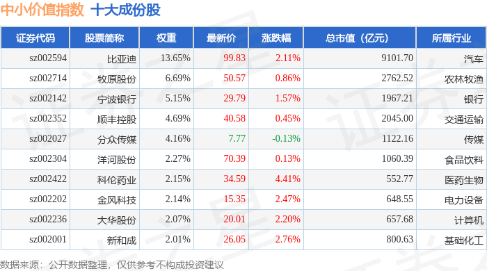 证券之星消息,11月13日,中小价值(399604)指数报收于2051.01点,涨1.22%,成交452.53亿元,换手率1.3%。当日该指数成份股中,上涨的有72家,永兴材料以10.0%的涨幅领涨,下跌的有26家,滨江集团以3.33%的跌幅领跌。