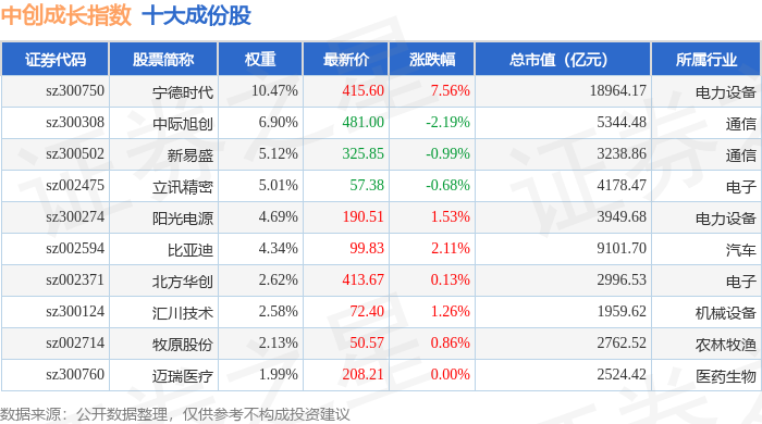 证券之星消息,11月13日,中创成长(399626)指数报收于2066.05点,涨2.32%,成交2738.9亿元,换手率3.59%。当日该指数成份股中,上涨的有125家,上能电气以20.0%的涨幅领涨,下跌的有39家,乖宝宠物以5.0%的跌幅领跌。