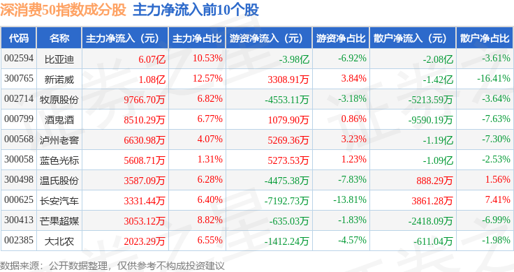 资金流向方面,深消费50(399646)指数成份股当日主力资金净流入合计9135.39万元,游资资金净流出合计2.77亿元,散户资金净流入合计1.86亿元。成份股资金流向详情见下表: