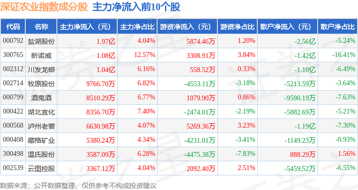 资金流向方面,深证农业(399669)指数成份股当日主力资金净流入合计2.9亿元,游资资金净流入合计2.3亿元,散户资金净流出合计5.2亿元。成份股资金流向详情见下表: