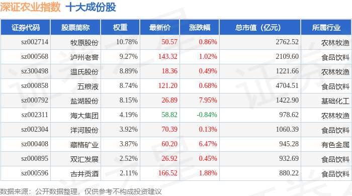 证券之星消息,11月13日,深证农业(399669)指数报收于8946.25点,涨1.7%,成交311.28亿元,换手率1.82%。当日该指数成份股中,上涨的有43家,新诺威以8.57%的涨幅领涨,下跌的有6家,乖宝宠物以5.0%的跌幅领跌。