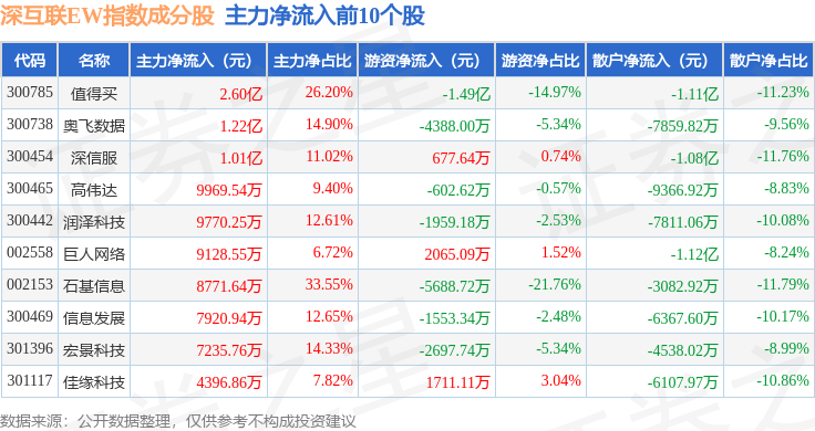 资金流向方面,深互联EW(399677)指数成份股当日主力资金净流出合计2.77亿元,游资资金净流出合计1.76亿元,散户资金净流入合计4.53亿元。成份股资金流向详情见下表: