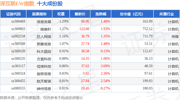 证券之星消息,11月13日,深互联EW(399677)指数报收于5675.78点,涨1.25%,成交526.59亿元,换手率2.48%。当日该指数成份股中,上涨的有143家,值得买以20.0%的涨幅领涨,下跌的有20家,慧博云通以3.14%的跌幅领跌。
