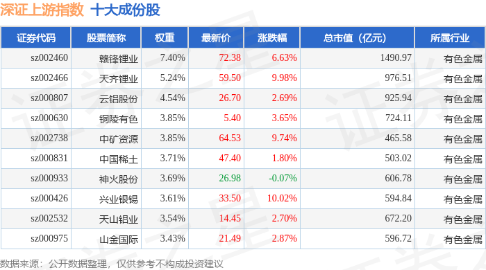 证券之星消息,11月13日,深证上游(399704)指数报收于6424.68点,涨4.46%,成交757.05亿元,换手率3.72%。当日该指数成份股中,上涨的有46家,兴业银锡以10.02%的涨幅领涨,下跌的有3家,中钨高新以0.88%的跌幅领跌。