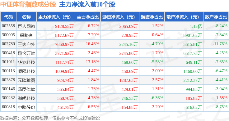 资金流向方面,中证体育(399804)指数成份股当日主力资金净流入合计4804.48万元,游资资金净流入合计7983.48万元,散户资金净流出合计1.28亿元。成份股资金流向详情见下表: