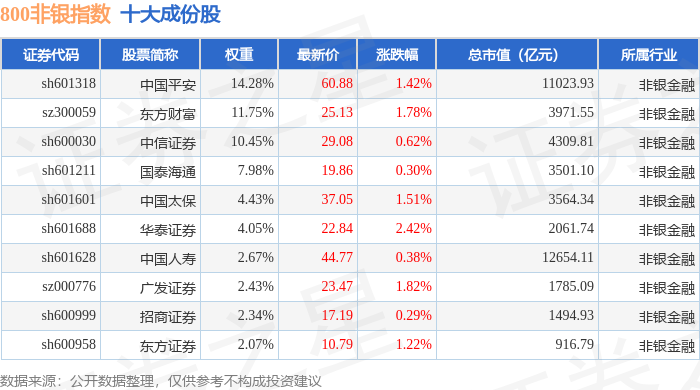 证券之星消息,11月13日,800非银(399966)指数报收于6595.05点,涨1.11%,成交398.33亿元,换手率0.76%。当日该指数成份股中,上涨的有49家,东兴证券以4.13%的涨幅领涨,下跌的有1家,新华保险以0.14%的跌幅领跌。
