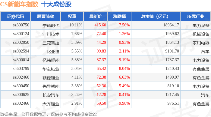 证券之星消息,11月13日,CS新能车(399976)指数报收于4697.5点,涨6.24%,成交1689.03亿元,换手率5.65%。当日该指数成份股中,上涨的有50家,天华新能以19.15%的涨幅领涨。