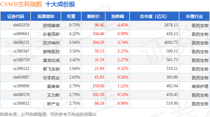 CSWD生科(399993)指数十大成份股详情如下: