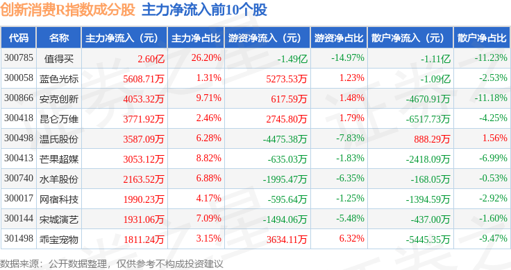 资金流向方面,创新消费R(470041)指数成份股当日主力资金净流入合计1.68亿元,游资资金净流出合计4220.05万元,散户资金净流出合计1.26亿元。成份股资金流向详情见下表: