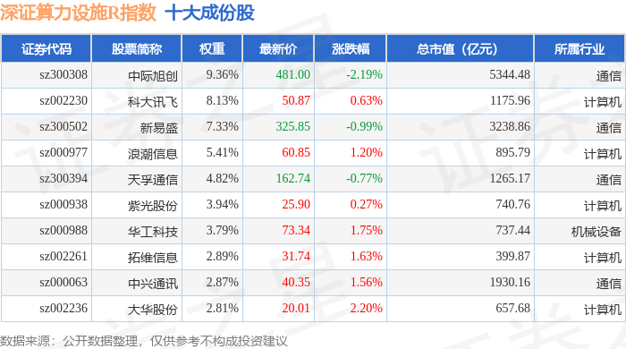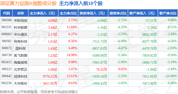 资金流向方面,深证算力设施R(470051)指数成份股当日主力资金净流入合计15.35亿元,游资资金净流出合计11.03亿元,散户资金净流出合计4.32亿元。成份股资金流向详情见下表: