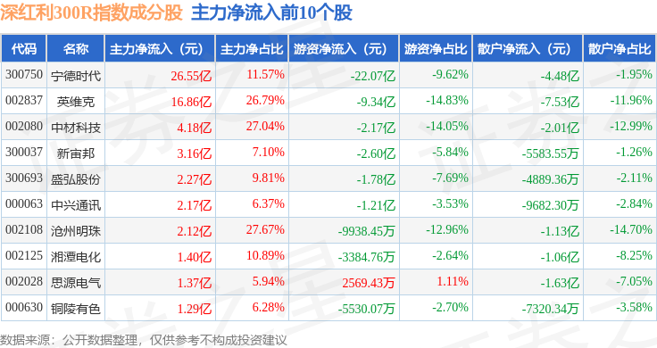 资金流向方面,深红利300R(470062)指数成份股当日主力资金净流入合计43.26亿元,游资资金净流出合计31.57亿元,散户资金净流出合计11.69亿元。成份股资金流向详情见下表: